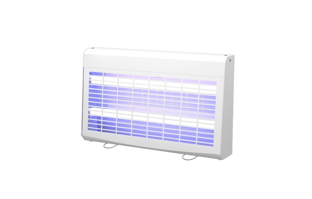 Trampa lumínica de acero inoxidable pintado en blanco, para colocar en la pared. Incorpora dos tubos UVA de alta capacidad de atracción. Fácil cambio tanto de la placa adhesiva como de los tubos.